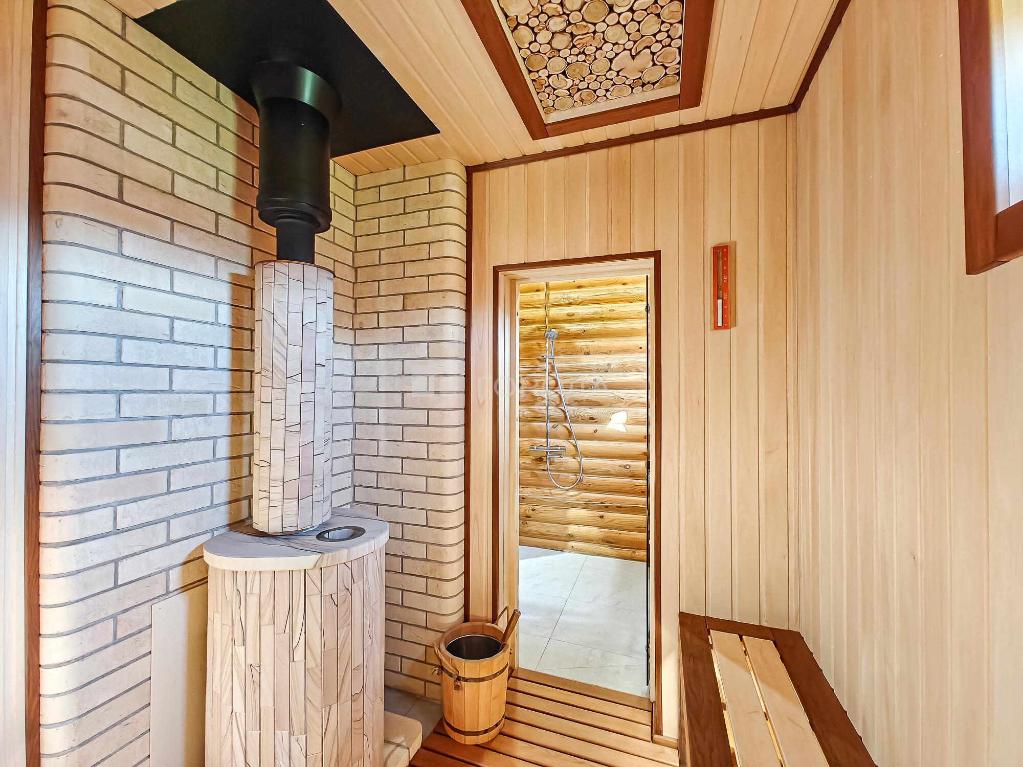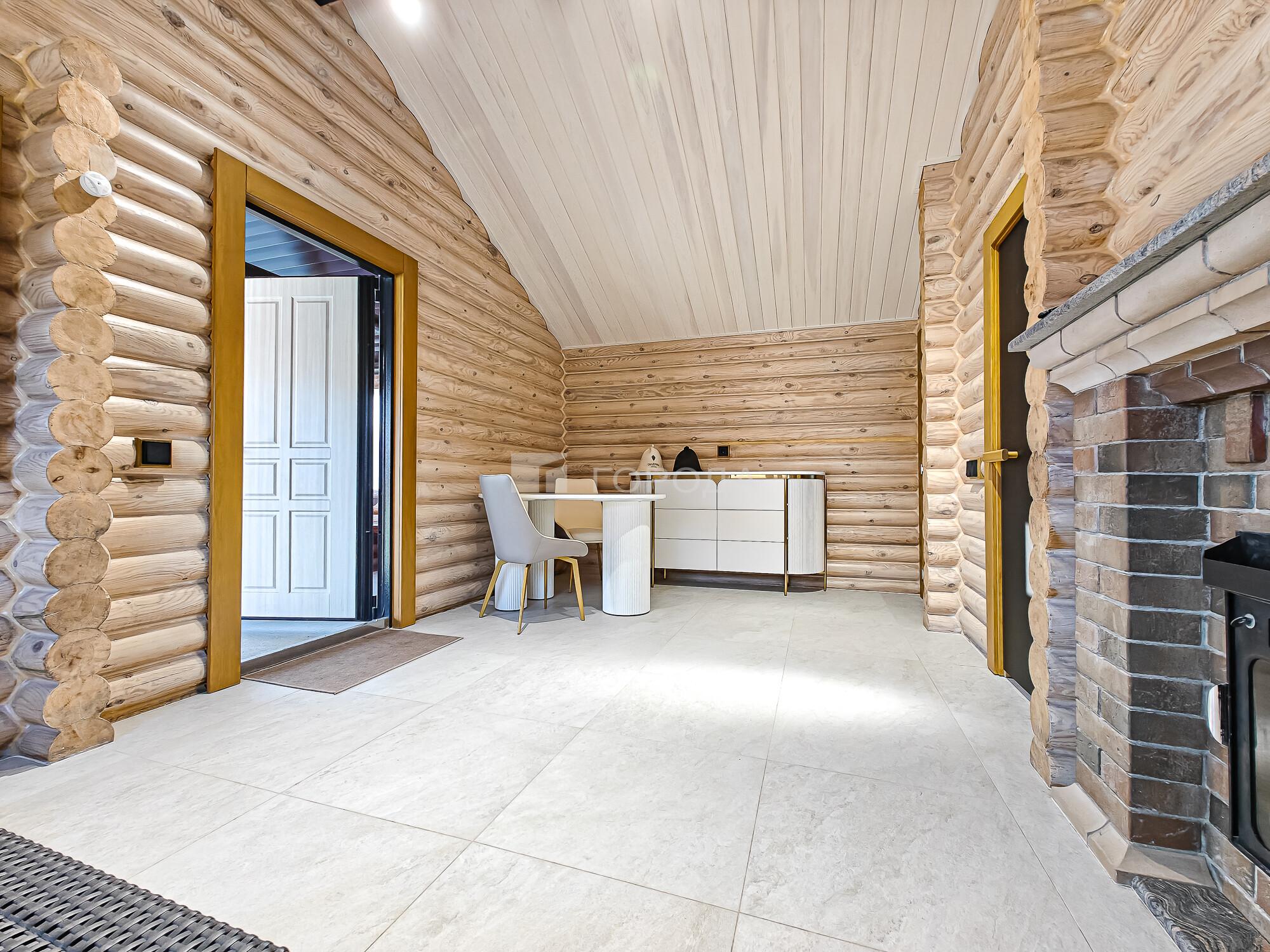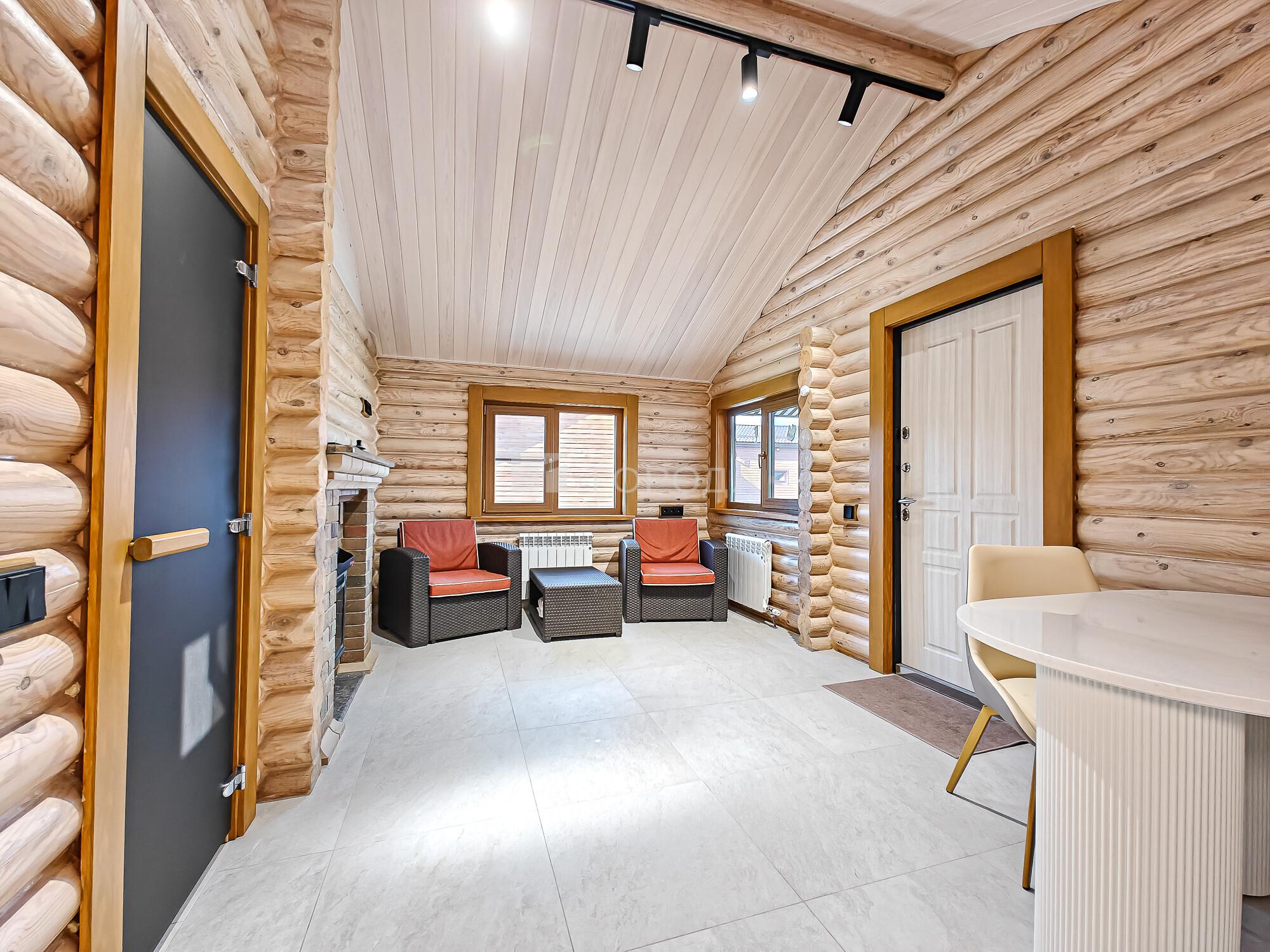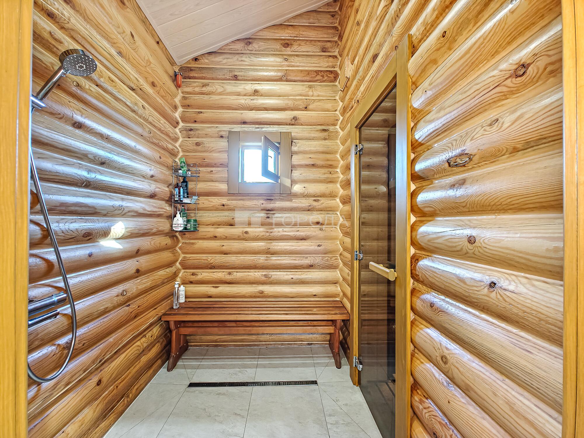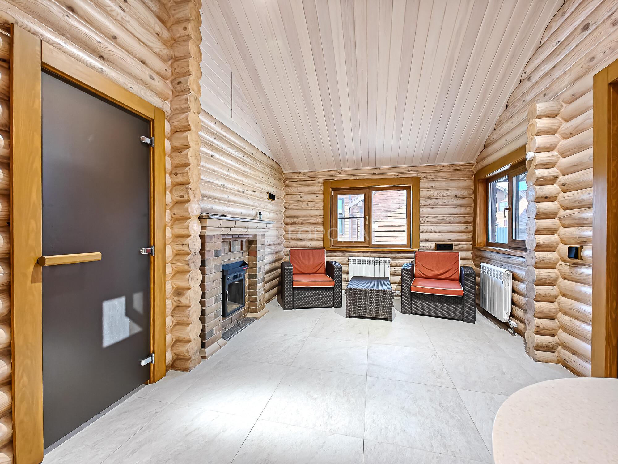 -Баня из оцилиндрованного бревна :просторная комната отдыха, моечное отделение, парильная.