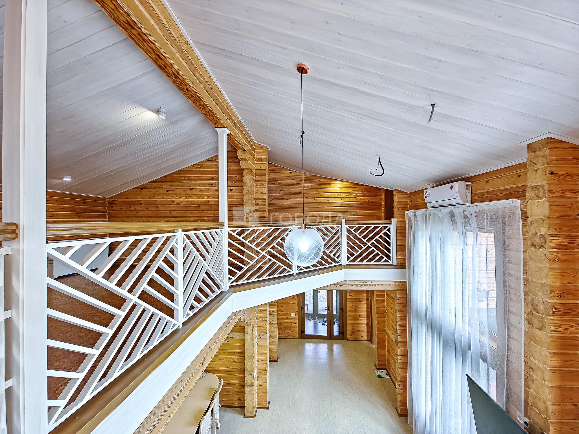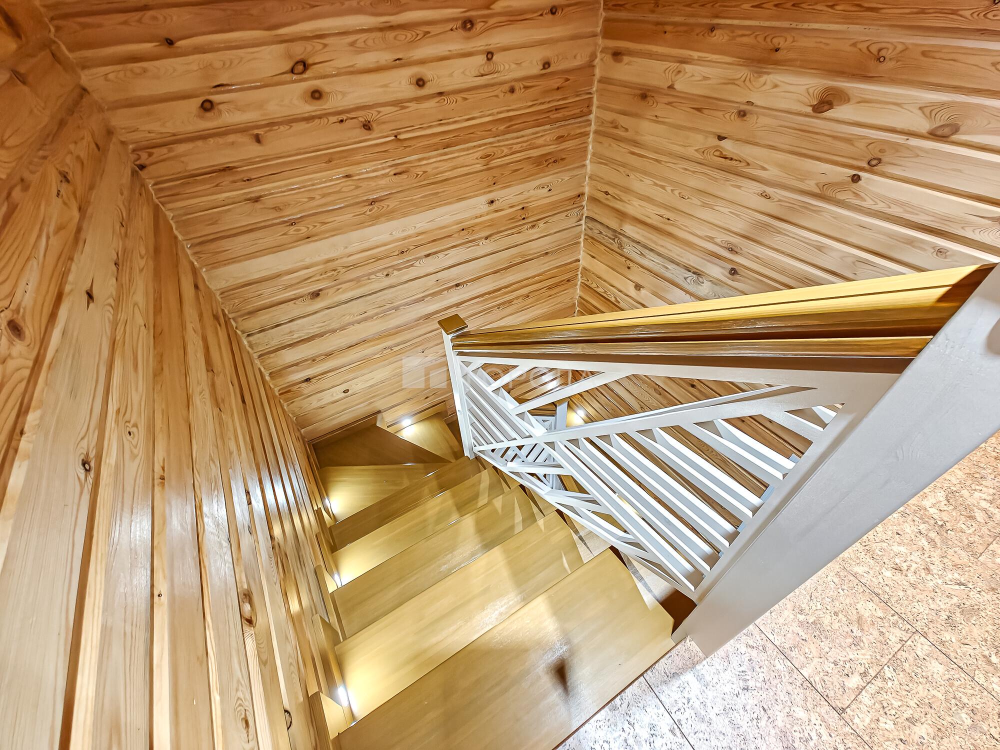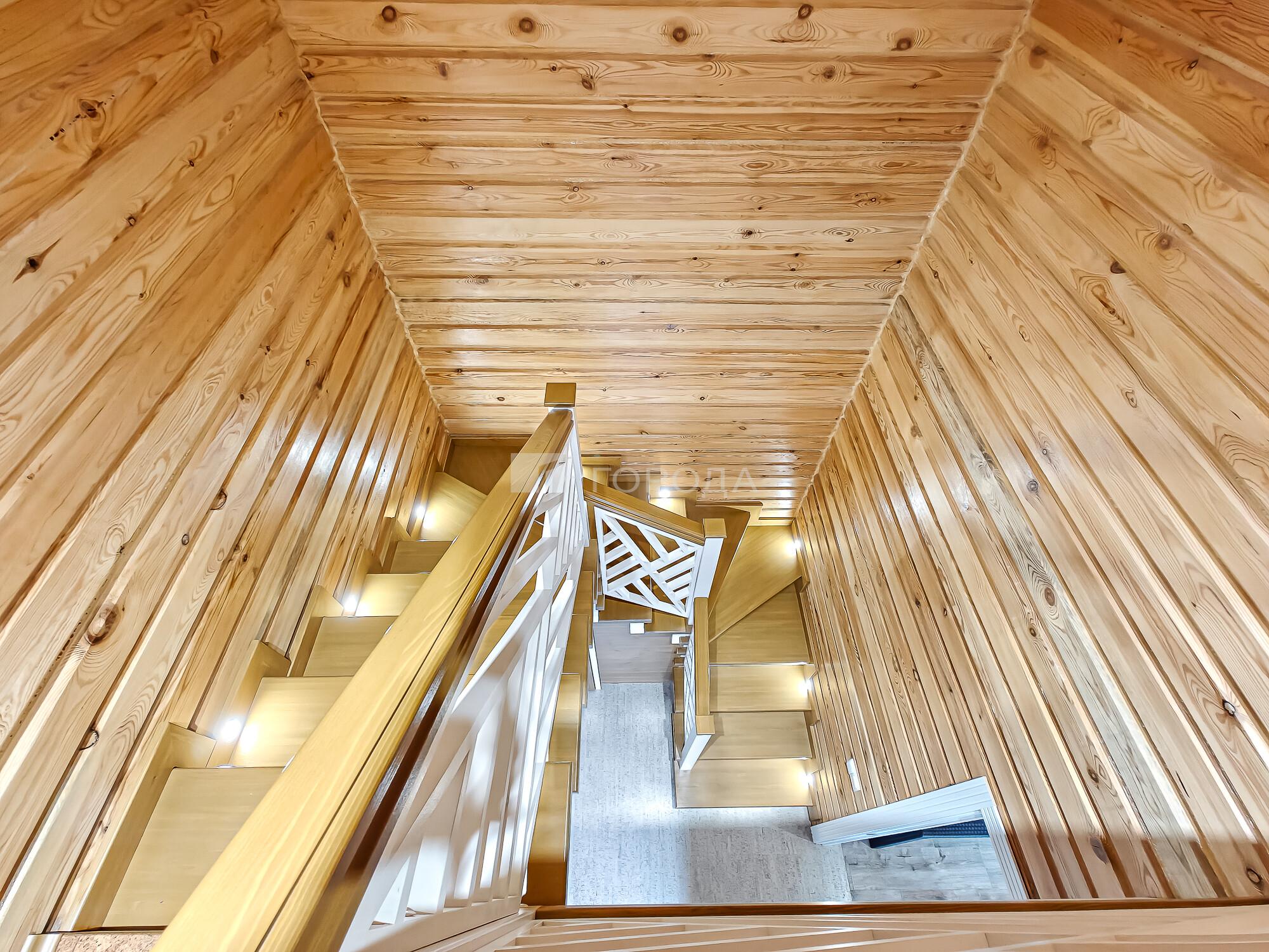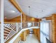 -Поднимаемся по деревянной лестнице на второй этаж дом: где расположены три уютные спальни, холл в виде балкона где открывается вид на гостиную с панорамными окнами
