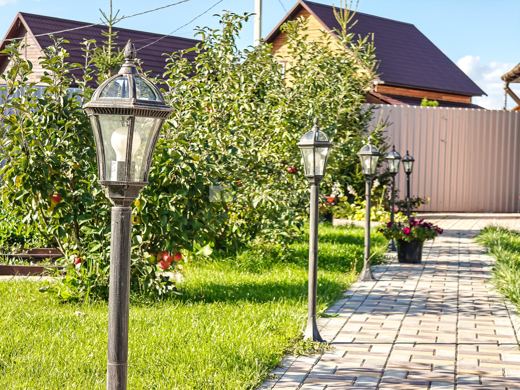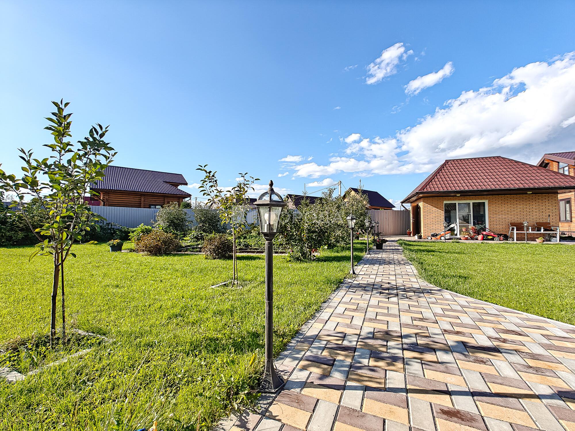 Сам участок просторный, (угловой) выполнен ландшафтный дизайн, газон, подсветка, высажены ели, цветы, имеется, несколько грядок клубники, кусты малины, , участок огорожен, установлено видео наблюдение-умный дом. На красивой территории участка сочетается зеленый ухоженный газон и каменная плитку, парковочное место на несколько автомобилей.