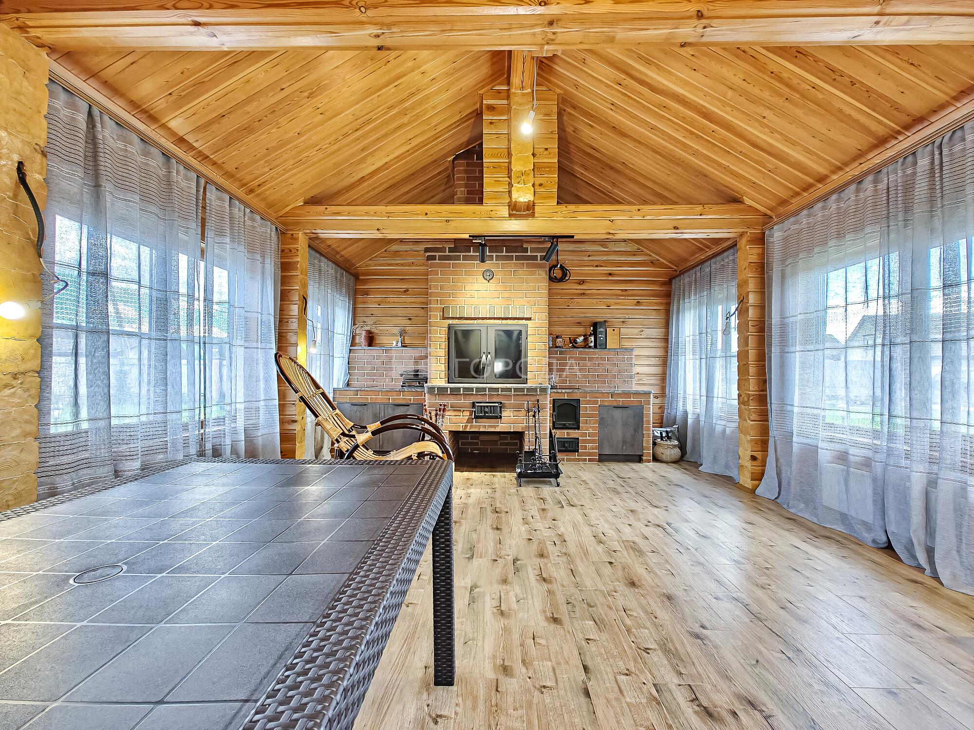 -на первом этаже дома расположились уютная . светлая кухня-гостиная, гостевая спальня, кабинет, помещение для барбекю где установлена русская печь, мангал, печь для казана, посудомоечная машина, стол, вмонтирована вытяжка, теплый пол, санузел с гардеробной, дополнительный выход во двор