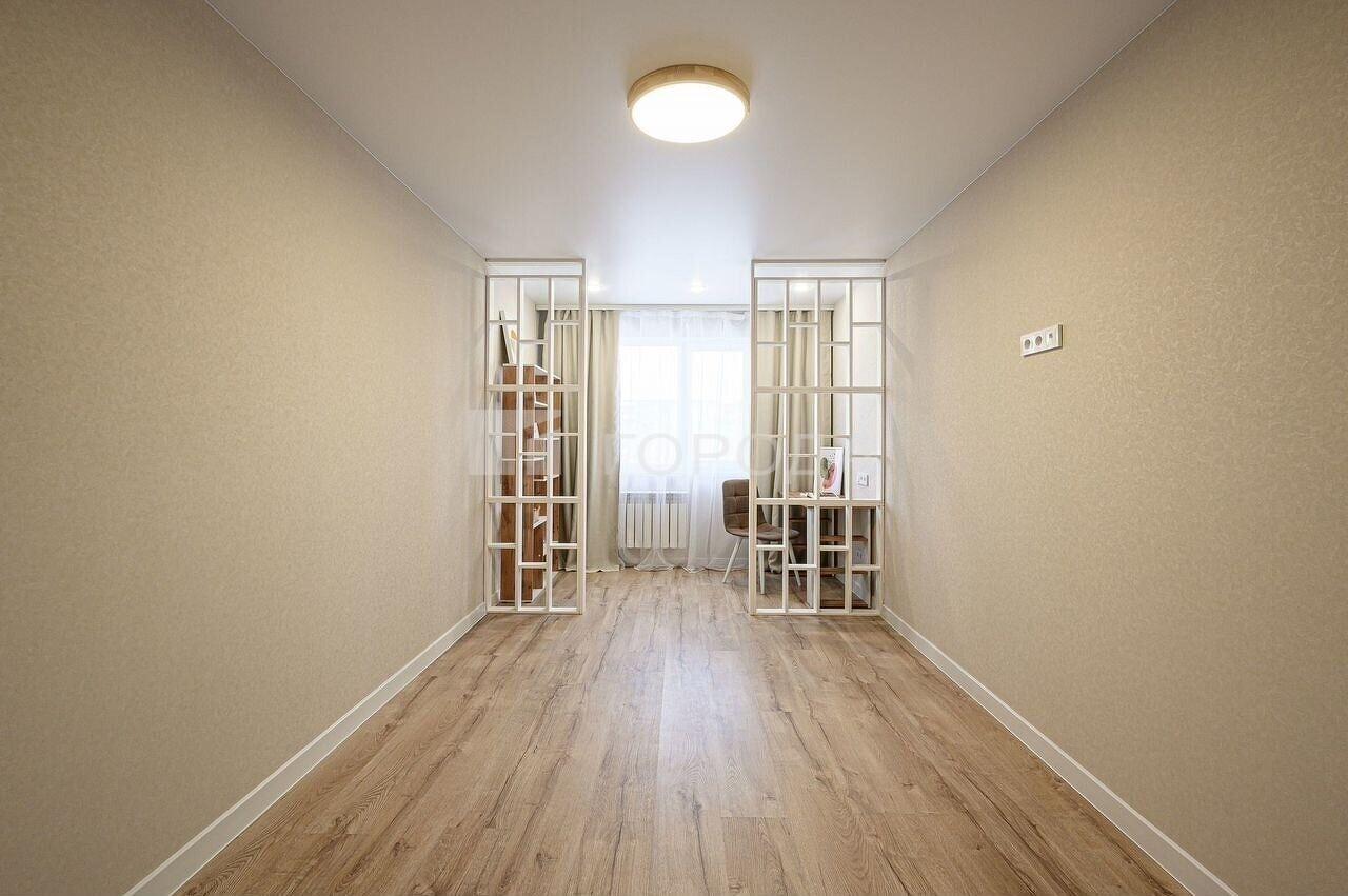Жилая комната разграничена интерьерной перегородкой. Выделена отдельная кабинетная зона. Все предметы мебели и интерьера остаются.