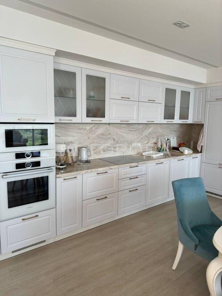 Остается встроенная мебель: кухня, два встроенных холодильника, микроволновая печь, духовка, электрическая плита, посудомоечная машина, гардеробная, встроенная мебель в ванной и кладовой, в кабинете и гостиной, а также шкафы в детской и прихожей.