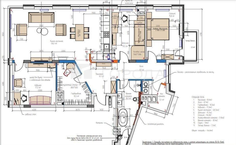 Общая площадь квартиры составляет 145 м², включая: